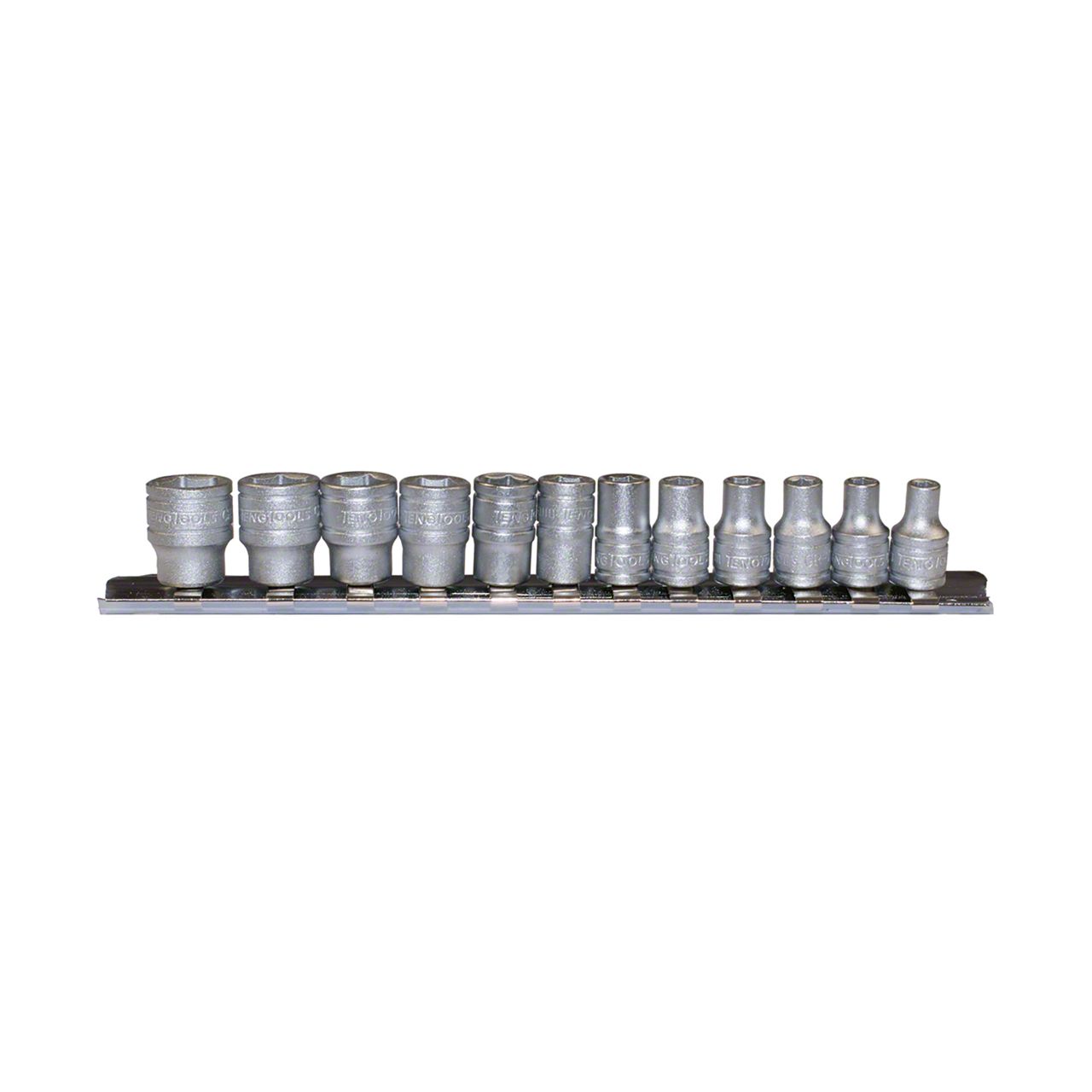 12 piece 1/4 inch drive 6 point shallow socket set. Sizes: 4, 4.5, 5, 5.5, 6, 7, 8, 9, 10, 11, 12, 13mm. Made from chrome vanadium steel with a satin finish for increased grip in oily environments. Supplied on a clip rail for storage. Accessories: 1 x clip rail (7.3 inches long) complete with 12 x 1/4 inch drive socket clips.