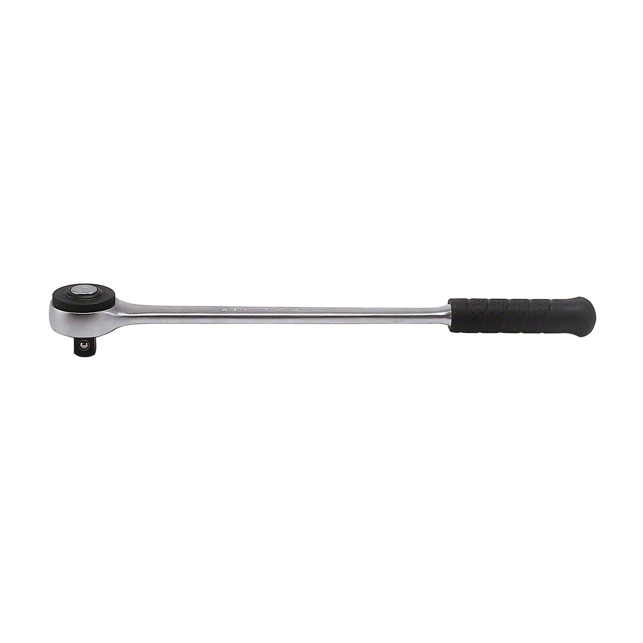 3/4 inch drive heavy duty professional quality 72 teeth ratchet. 72 teeth gives a working arc of just 5 degrees. Twist reverse action for changing the ratchet direction with one hand. Socket retainer and quick release in the ratchet head for added safety. Compact head design permits use in confined areas. Rubber handle for increased comfort. Chrome vanadium steel with a satin finish for extra grip, especially in oily environments.