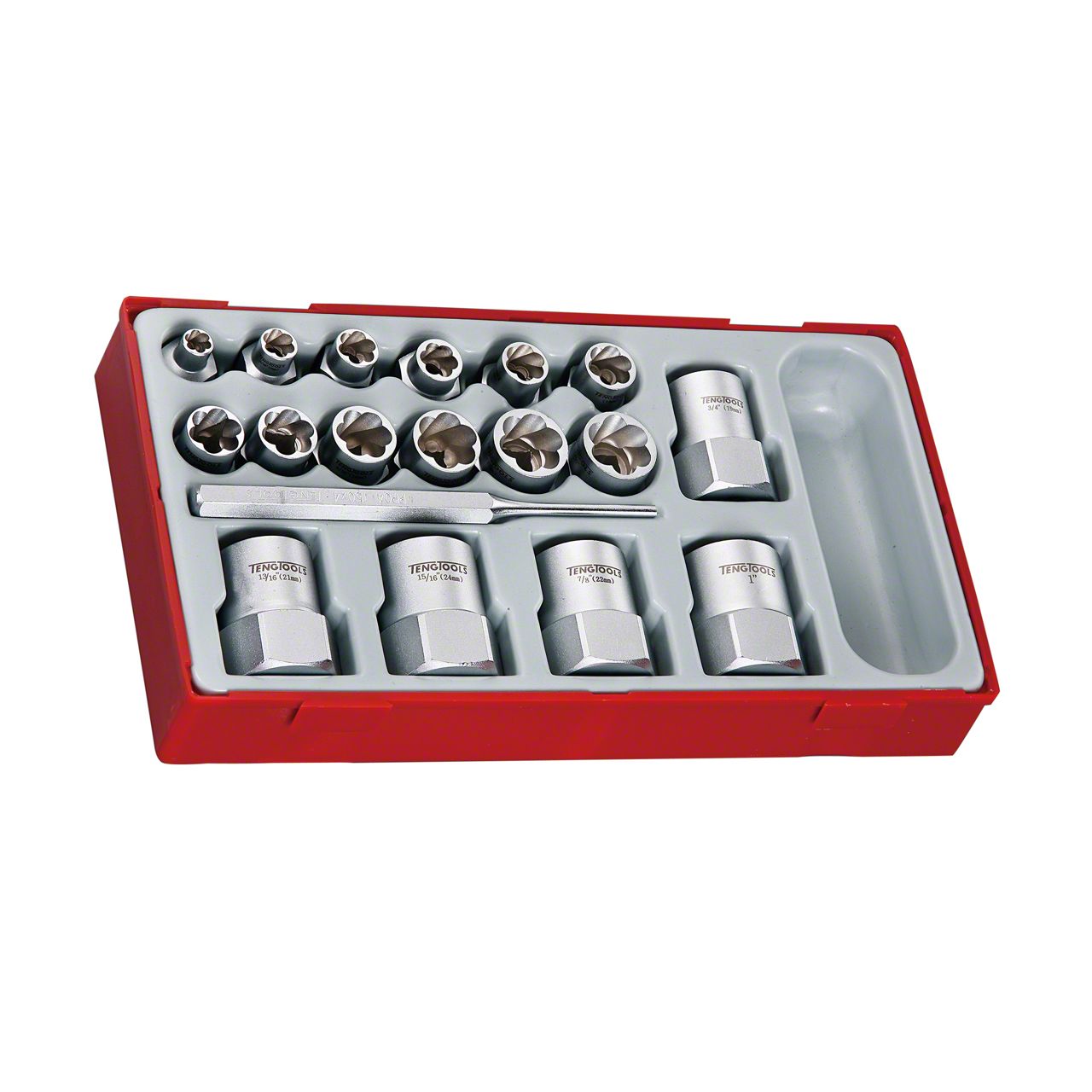 4mm , 6 inch long parallel pin punch 3/8 Inch Drive stud extractors metric sizes 6, 8, 10, 11, 12, 13, 14, 16, 17mm 3/8 Inch Drive stud extractors SAE size 5/16, 3/8, 7/16, 1/2, 9/16, 5/8 1/2 Inch Drive stud extractors metric sizes 19, 21, 22, 24, 25mm 1/2 Inch Drive stud extractors SAE sizes 3/4, 13/16, 7/8, 15/16,  1 Inch