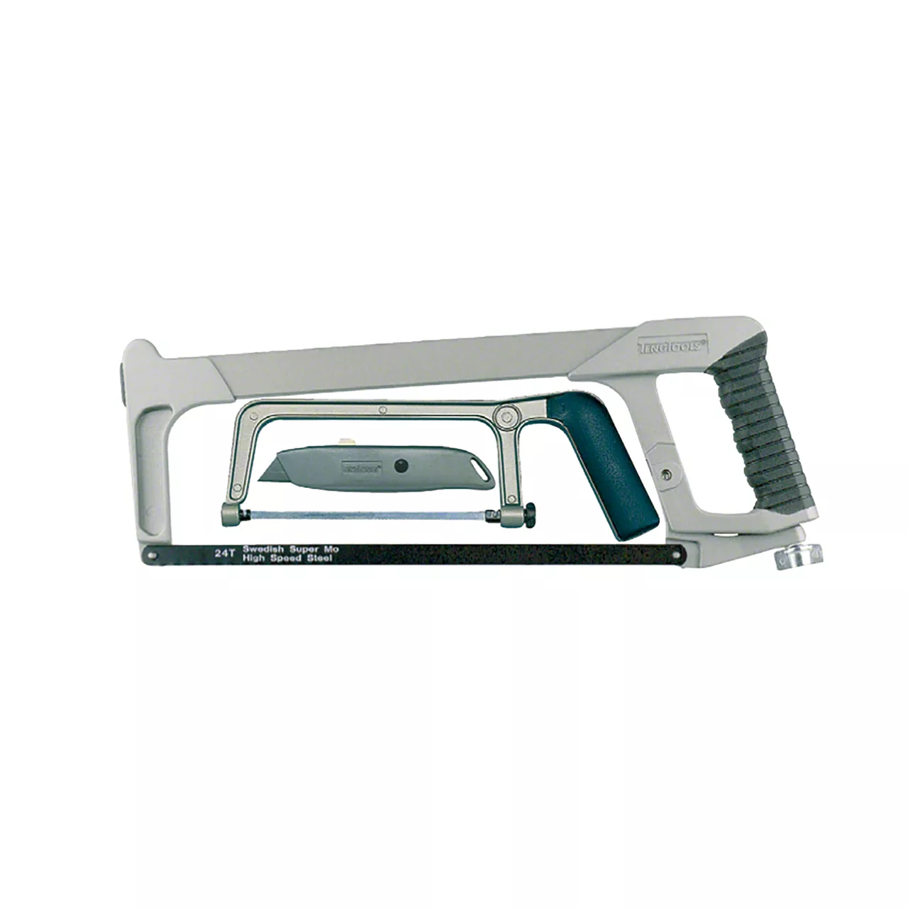 Set Contains:  3 Tools 12 Inch Hacksaw: Professional quality steel hacksaw frame featuring an ergonomically designed aluminium handle 12 Inch Swedish M2 HSS 24 teeth blade as well as facilities for presetting at a 45 degree or 90 degree cutting angle or for use as a key hole saw The frame also includes storage space for extra blades 6 Inch Mini Hacksaw: Professional quality mini hacksaw frame complete with three 6 hacksaw blades and a 6 position blade setting. Utility Knife: Heavy duty utility knife featuring a retractable blade and supplied complete with two spare blades.
