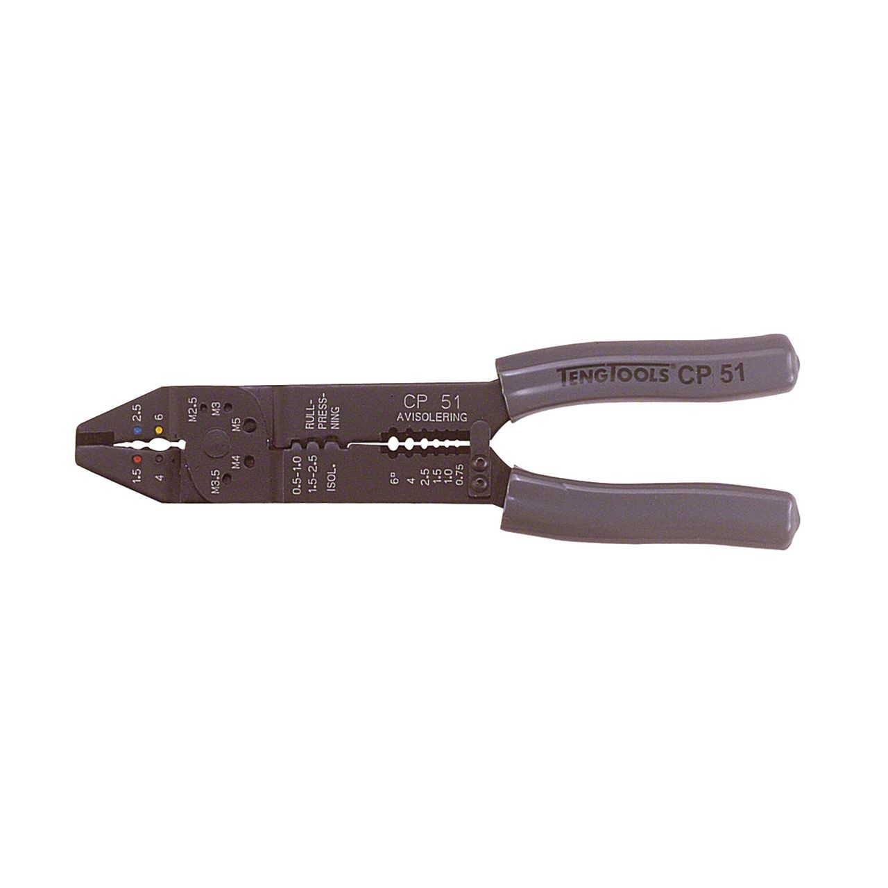 Professional quality 9 Inch crimping and wire stripping pliers.  Suitable for crimping insulated terminals from 0.75 to 6mm and non insulated terminals from 0.5 to 2.5mm (push on type).  The pliers features screw bolt cutting from M2 to M5 and stripping wire from 0.75 to 6mm).