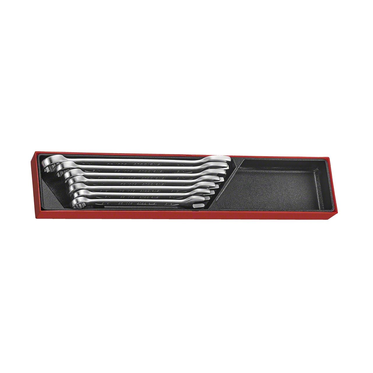 Combination spanners - 13/16in. 7/8in. 15/16in. 1in. 1-1 /16in. 1-1 /8in. 1-1 /4in. The 12 point ring head is set at a 15 degrees angle to facilitate use even on flat surfaces All ring heads are equipped with the Teng Tools Hip Grip system which means the contact surface grips on the flat surfaces of the nut rather than on the corner. This helps prevent damage to the nuts and bolts and makes it possible to grip nuts and bolts which already have damaged corners Made from high grade chrome vanadium with polished heads and a satin finish for extra grip in oily environments The Teng Tools concept is based on each tool having its own place. Each TT set acts as a part in an organised system by being clicked together with other TT sets and fits perfectly in your service case, tool box or roller cabinet. No space is wasted and each tool sits perfectly in place. This means it is much easier to see whether any tools are missing at the end of the day.  5 Steps to Get Organized  Choose storage: case/top box, middle box or roller cabinet Choose the TT- sets you would like. Take off the lid Click the sets together Place them in the storage!