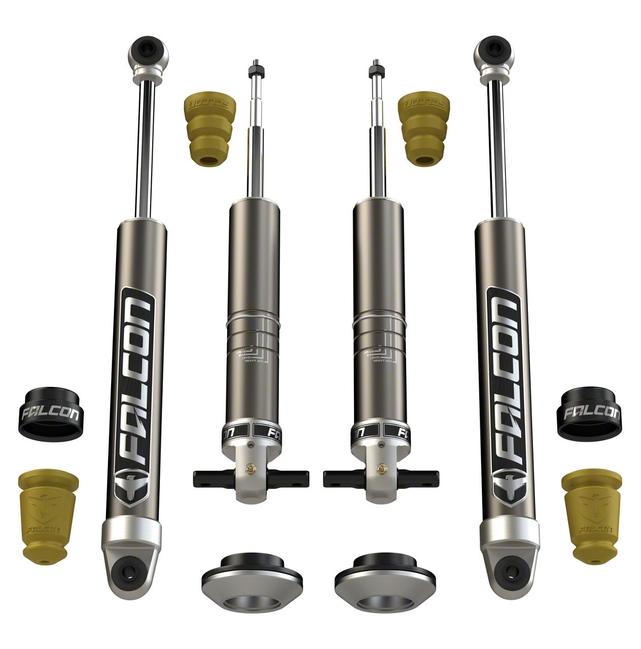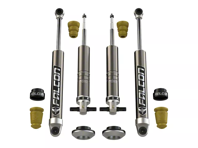Powerful Shock Absorbers. Designed to provide your truck with a competitive edge, this leveling system features powerful shock absorbers. They are designed with Falcon’s proprietary Volume Optimized Damping (VOD) that has a digressive linear valve for increased damping volume. This results in improved vehicle feedback and control in low-speed driving. The VOD also prevents your vehicle from bottoming out at full compression when driving at high speeds or on uneven roads.