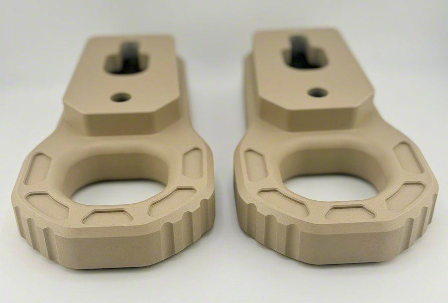 Construction and Appearance. These tow hooks are crafted from high-strength 6061-T6511 aluminum using precise CNC billet machining. The tan powder-coated finish not only provides a rugged, attractive appearance but also enhances durability, protecting against corrosion and wear.