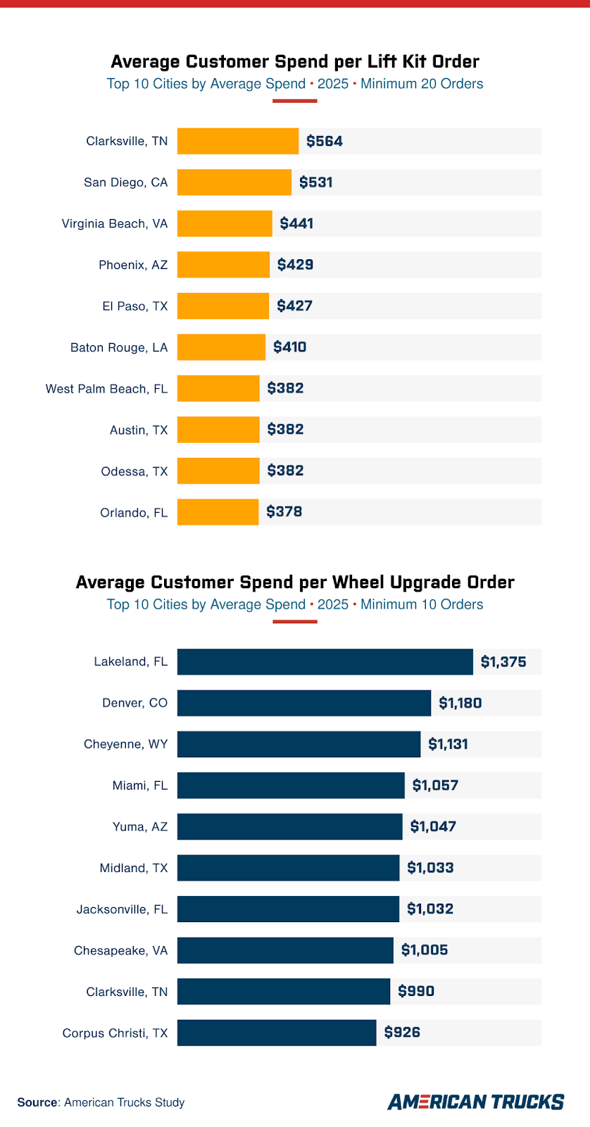 - Clarksville, TN, drivers spend more on lift kits than those in any other city analyzed, averaging $564 per order, while Lakeland, FL, leads in wheel upgrades with an average order value of $1,375.