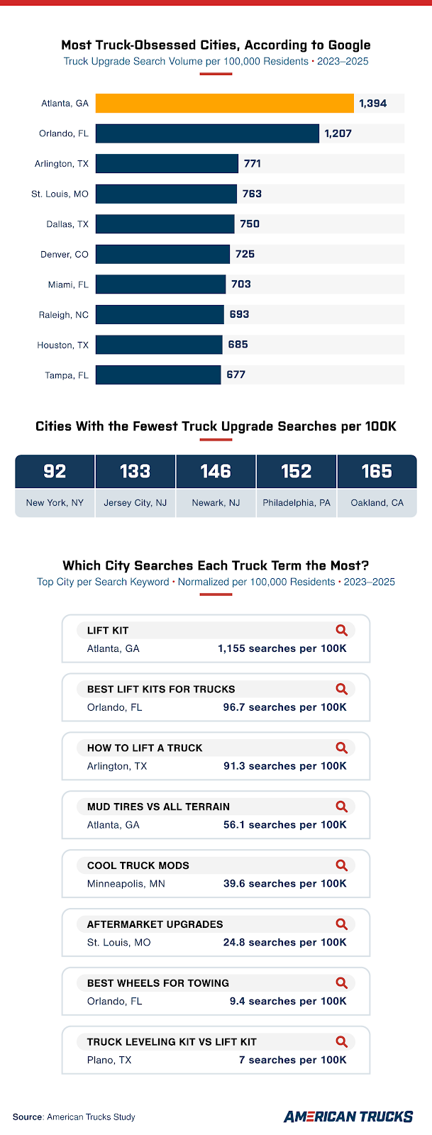 - Atlanta leads in searches for "lift kit" and "mud tires vs all terrain," while Orlando leads in "best lift kits for trucks" and "best wheels for towing."