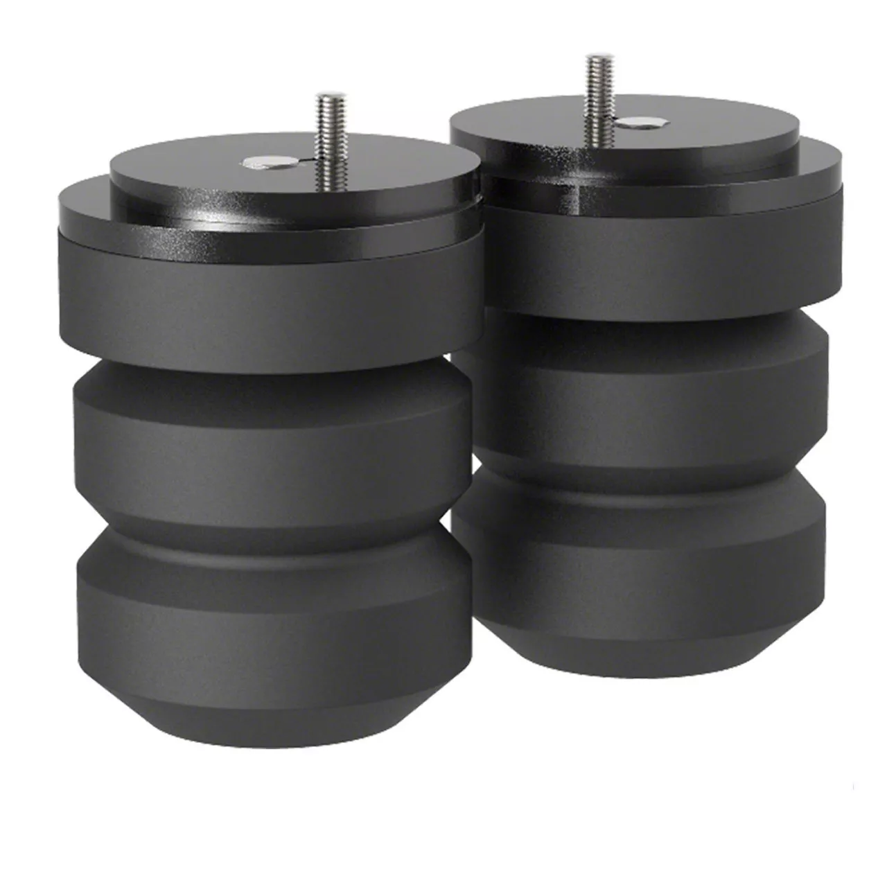 Made to Handle Heavy Loads. Even though the springs in this system are hollow, they’re crafted from high-quality, heavy-duty rubber. Their construction gives them the strength to endure your rugged drives, as well as the weight of 3000-pound loads. Additionally, they come in a sleek black color to match the look of your vehicle’s OE suspension setup.