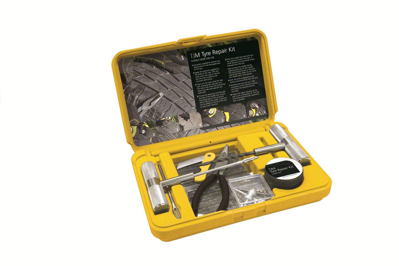Description. An essential accessory for off-road travellers, the TJM Tyre Repair Kit is an easy solution for fixing tyre punctures while you're off the beaten track. An effective temporary solution that will help keep your adventure going, the TJM Tyre Repair Kit allows you to seal tyre leaks and get to safety. Everything you need to repair most types of tyre or valve damage is included in the kit, while it's all easy to store thanks to its protective case.