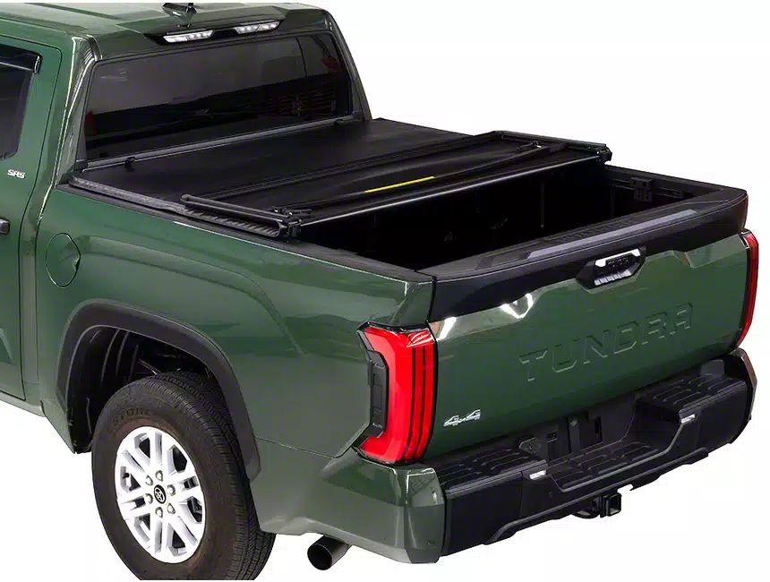 Tonno Pro's TonnoFold soft tri-folding truck bed cover is one of the easiest to use tonneau covers with exceptional durability and great looks. Its tear-resistant, double-sided vinyl top is long lasting and can handle heavy winds, light rain and snow. Under the notably strong vinyl is a powder-coated aluminum frame for an added level of protection from everyday wear and tear. This tri-folding cover keeps a tight fit to the truck bed, does not sag and has limited flutter when vehicle hits high speed. TonnoFold is delivered completely assembled making install a breeze -- no drilling necessary. Simply square up the cover to your truck bed and use its easy-to-use clamping system to lock it securely in place. Hauling large cargo? Completely remove the cover in minutes to meet your unique carrying needs.