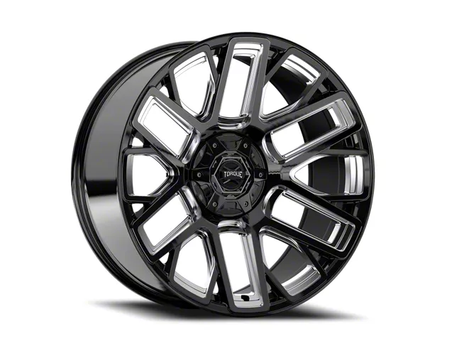 The 20x9 Torque Wheels TW428C Slope Gloss Black Premium Milled 6-Lug Wheel; 20x9; -12mm Offset is completed in a high-quality gloss black finish with steel milled accents, which is sure to turn heads. There is a durable clear coat for extra protection and enhanced appearance that can withstand the rigors of the road.