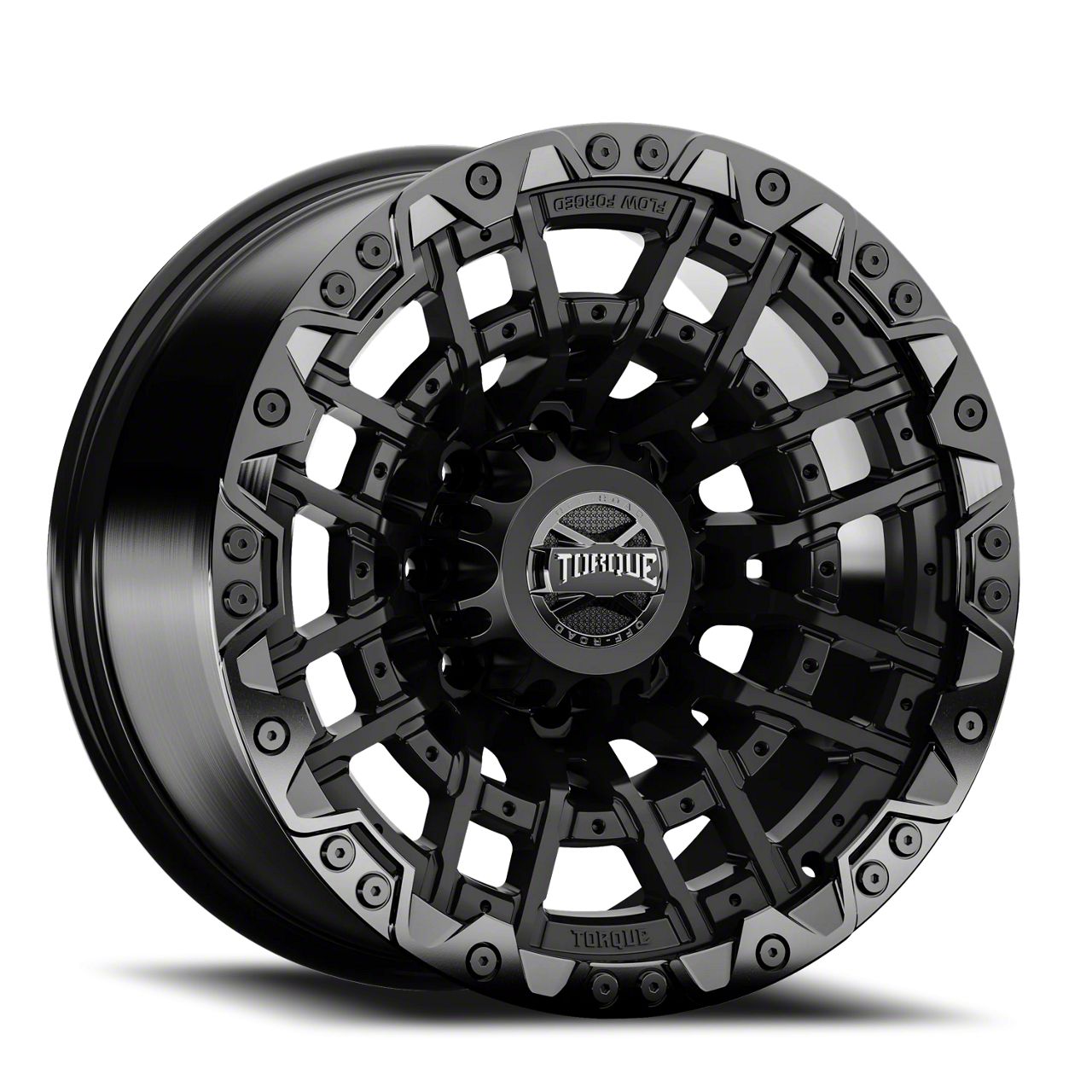 The 18x9 Torque Wheels TW419R Cliffhanger Satin Black with Gloss Black Lip 6-Lug Wheel; 18x9; 0mm Offset is completed in a high-quality satin black finish with a gloss black lip, which is sure to turn heads. There is a durable clear coat for extra protection and enhanced appearance that can withstand the rigors of the road.