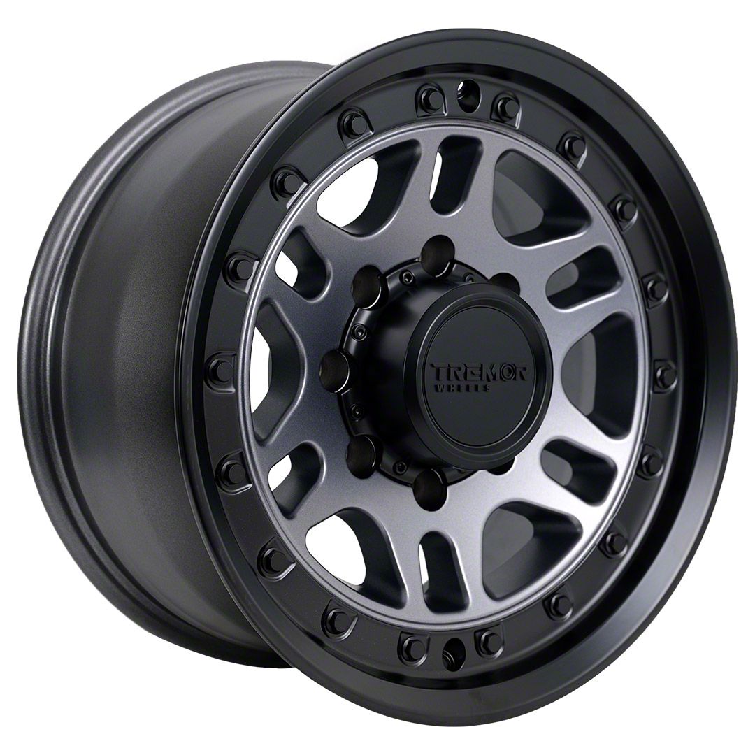 Tremor Wheels 105 Shaker Graphite Grey with Black Lip 8-Lug Wheel; 20x9; 0mm Offset offers a striking balance between style and durability. The design speaks to the brand's commitment to quality, enhancing the vehicle's appearance with its distinct look. This wheel, with its unique aesthetics, is ideal for drivers who appreciate a blend of modern design and robust functionality.