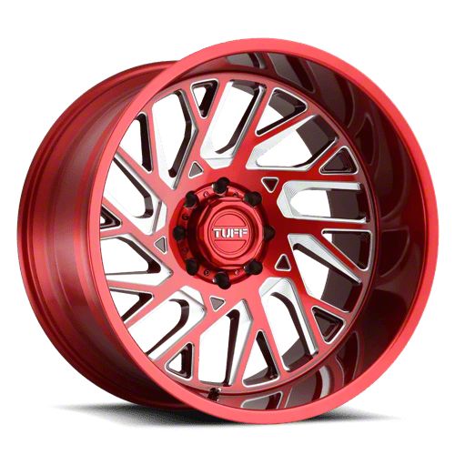 This 24x14 Tuff A.T. T4B Candy Red with Milled Spoke 8-Lug Wheel is completed in a high-quality candy red finish with accents that will be the envy of everyone. For added strength and aesthetics, there is a durable clear coat that withstands the rigors of daily driving.