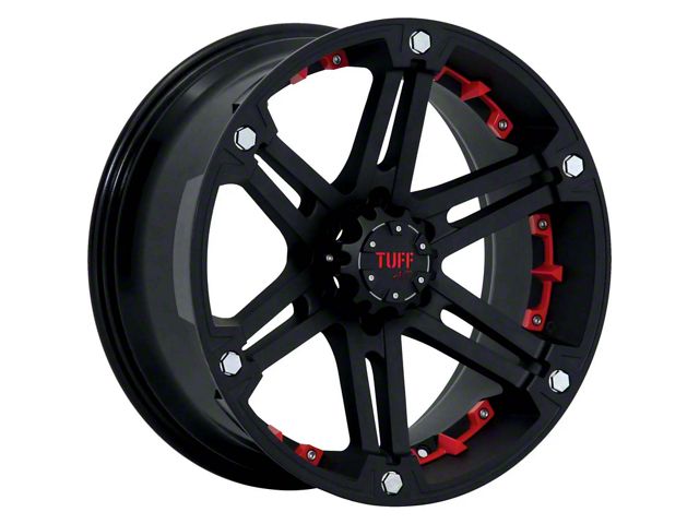 Tuff A.T. T01 Flat Black with Red Inserts 5-Lug Wheel; 17x8; 10mm Offset The Tuff A.T. T01 Flat Black with Red Inserts 5-Lug Wheel combines a sleek, sophisticated design with premium construction that enhances the visual appeal and complements a wide range of vehicle styles. This wheel is perfect for those seeking to make a bold statement while maintaining elegance and robustness.