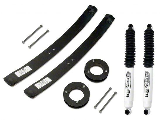 All Things Included. When you want your truck to dominate on and off the blacktop, Tuff Country 2 in. Lift Kit w/ SX8000 Shocks is the perfect set for you. This set comes with everything needed to boost your truck from the boring factory look to an upgraded mod look. This kit marries together quality stock performance with an aggressive look. You will receive a modest two inches in the front and rear of your truck for a level and even stance when you are on the road. No more worry about a front end that sits higher or lower than the other. When you want a lift kit that is not only reliable, but durable as well, turn to the Tuff Country 2 in. Lift Kit w/ SX8000 Shocks. You will enjoy the increased ground clearance and this kit can support tires up to 33x12.5 inches.