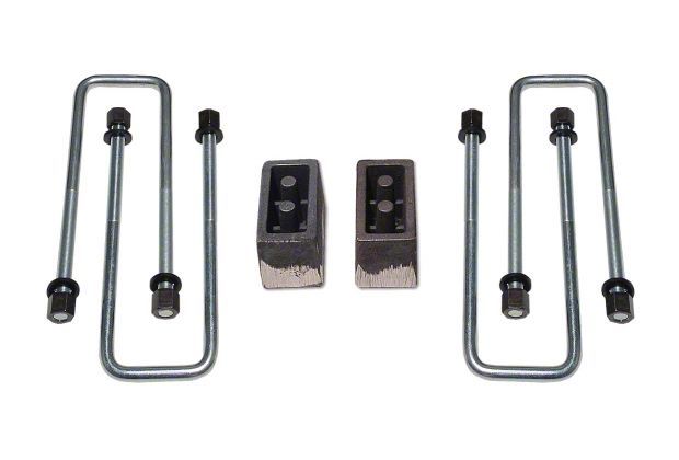 Construction and Features. These lift blocks feature a matte black and raw metal finish for a rugged and durable appearance. The kit includes sturdy lift blocks and U-bolts designed for long-lasting performance and secure installation, ensuring your truck’s suspension remains reliable in demanding conditions.