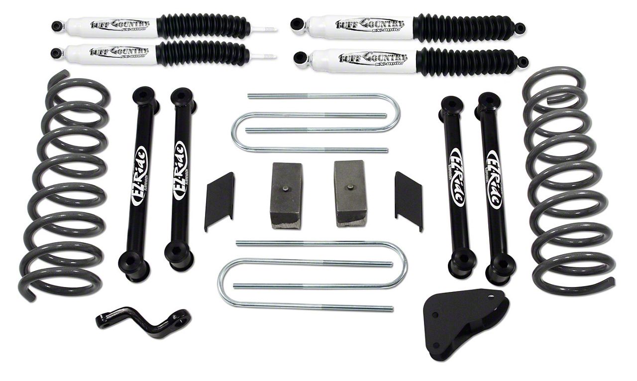 Get additional tire clearance to fit 37 inch tires and get a cool new look with this Tuff Country Dodge Ram 6 inch lift kit. This Dodge lift kit uses new front coil springs to lift the front end 6 inches. Rear cast iron blocks lift the rear of the Ram. Extended upper and lower control arms w/poly bushings, a track bar relocating bracket and drop pitman arm to ensure everything is aligned properly.