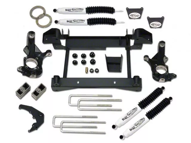 Construction and Features. Featuring a blend of matte black, clean white, and raw metal finishes, this lift kit adds durability and visual appeal to your truck. The kit includes premium components such as steering knuckles, a 1-piece subframe, shocks, lift blocks, and U-bolts, all designed for reliability and improved performance. The high-quality construction ensures your suspension is ready for challenging terrains.