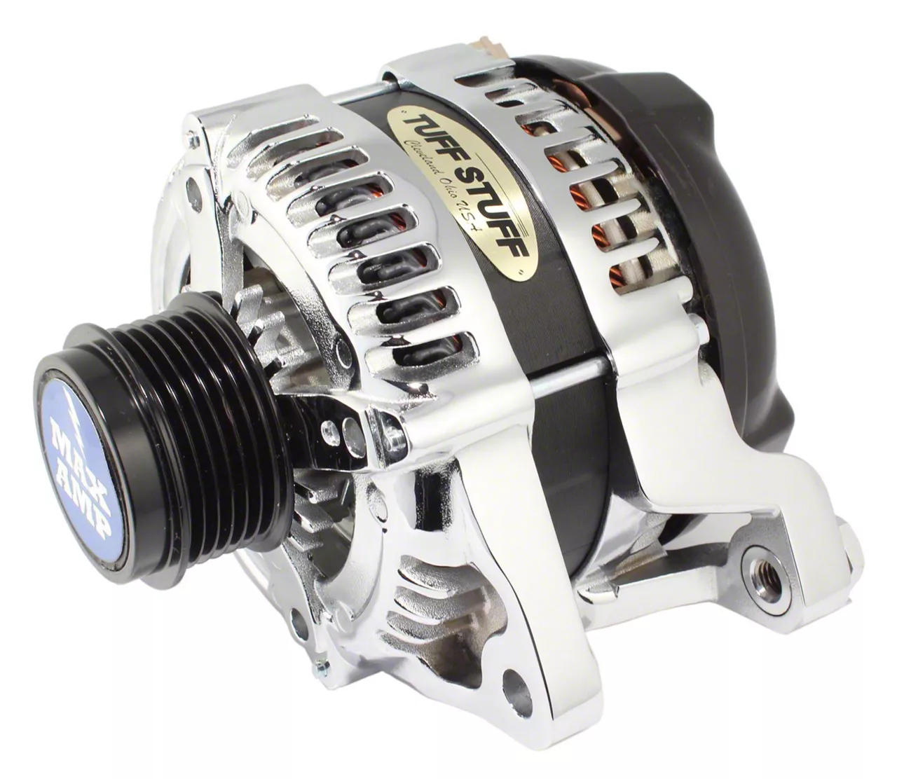 High Output. Built for the 3.7L and 5.0L Ford F-150, this Tuff Stuff Performance Alternator comes in a polished chrome finish and includes a 6-groove pulley. Made for 12 Volt and negative ground applications, this alternator has a high output of 175 amperes and is made from entirely new components.