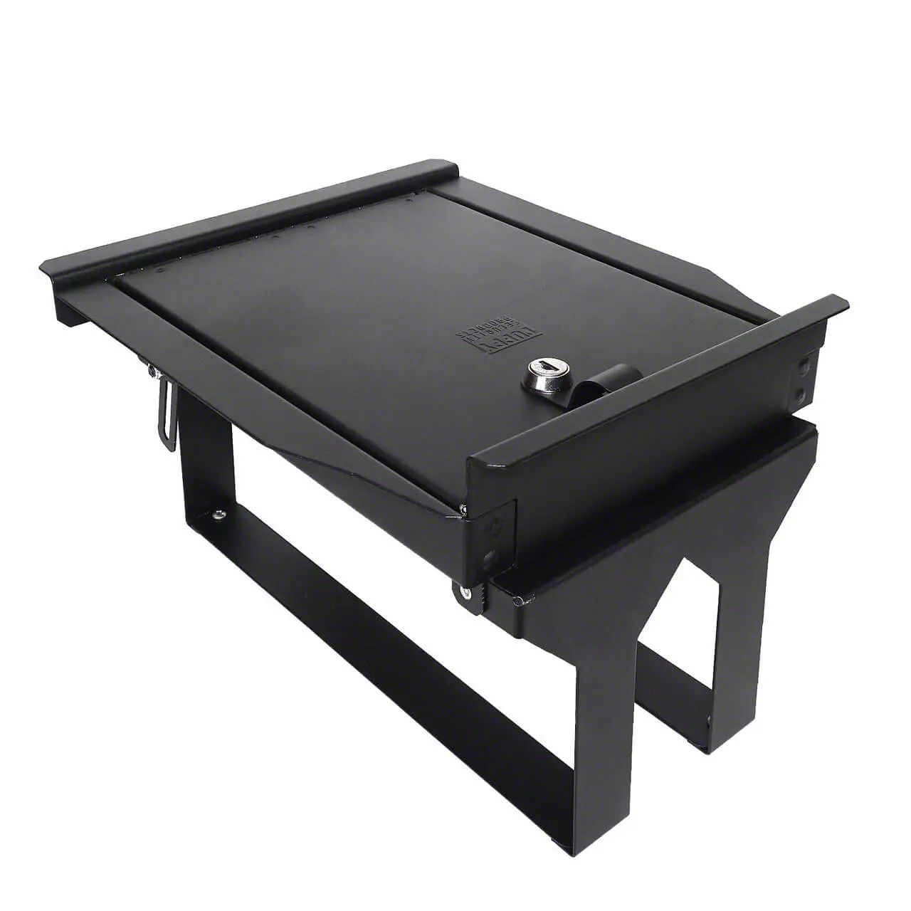 Description. Tuffy designs and manufactures the finest console safes in the industry. Tuffy continues this legacy with the new console safe for the 2021 Ford F-Series flow-through center security console safe. It maintains a completely stock look including full use of the factory accessory tray, armrest and lid. Featuring a durable texture powder coat finish, the safe comes ready to install in just a few minutes without drilling.