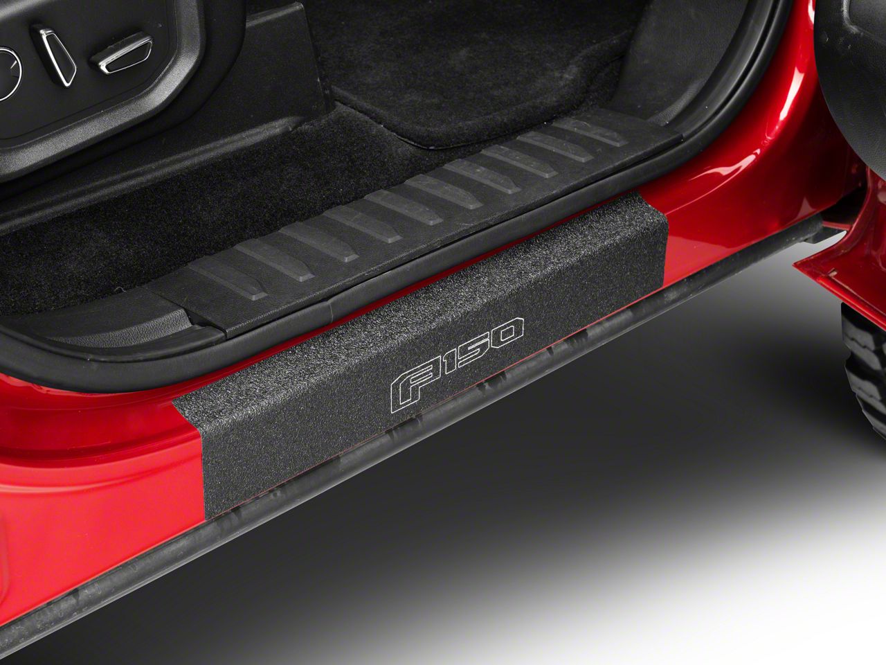 Application. The TufSkinz TUF-LINER Black Front Door Sill Protection with Black and Gray F-150 Logo fits all 2015 to 2026 Ford F-150 models.