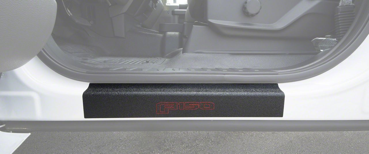 Rugged-Looking Scratch Protection. The Front Door Sill Protection with F-150 Logo; TUF-LINER Black; Black and Red are the door sill accents that offer rugged good looks and effective scratch protection. This is accomplished by a specialized multi-layer construction that includes a unique TUF-LINER substrate. This substrate is similar in looks to spray-in bed liners and provides the same level of scratch protection.