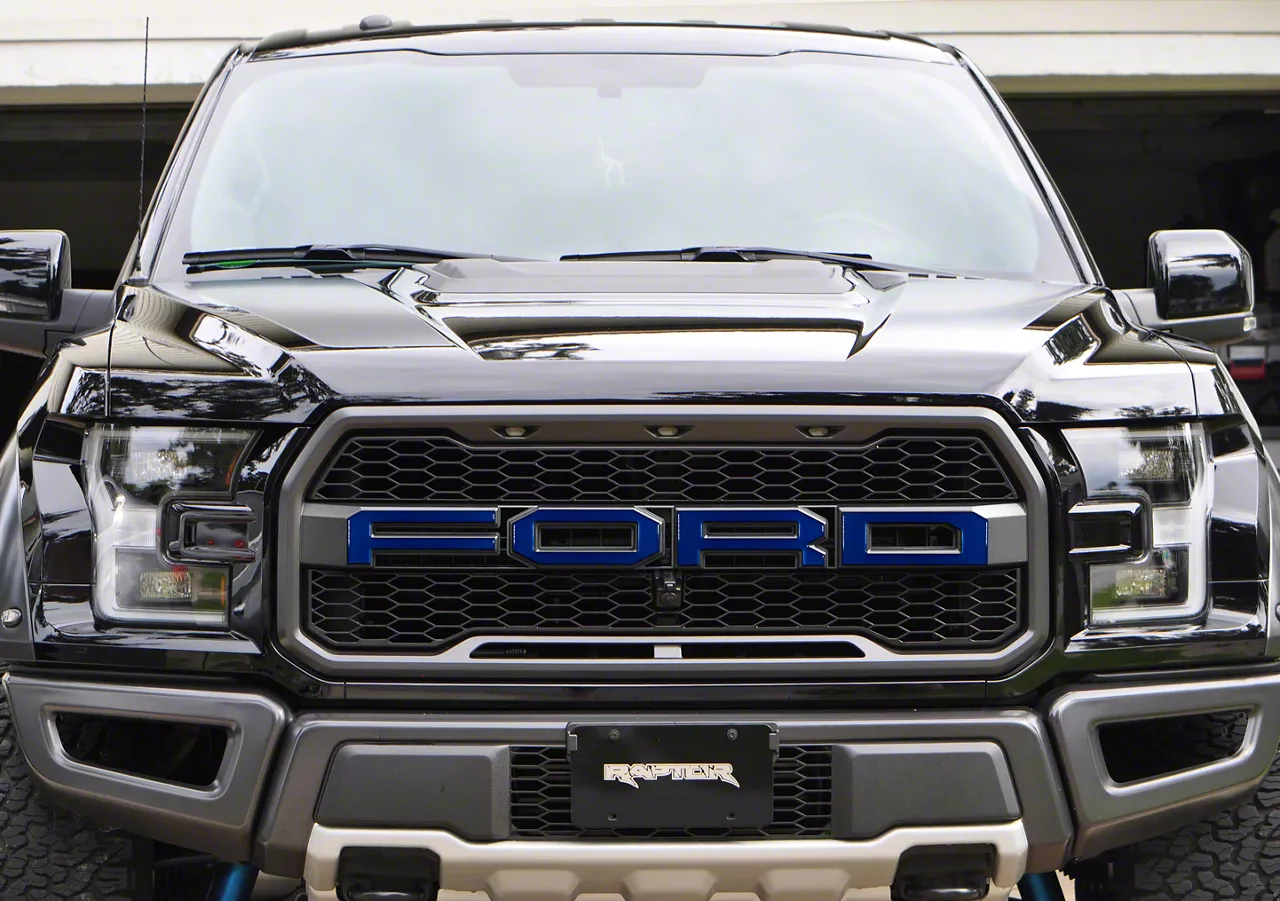 Application. These Tufskinz Front Grille Letter Overlays; Lightning Blue fit 2017-2020 F-150 Raptor models.