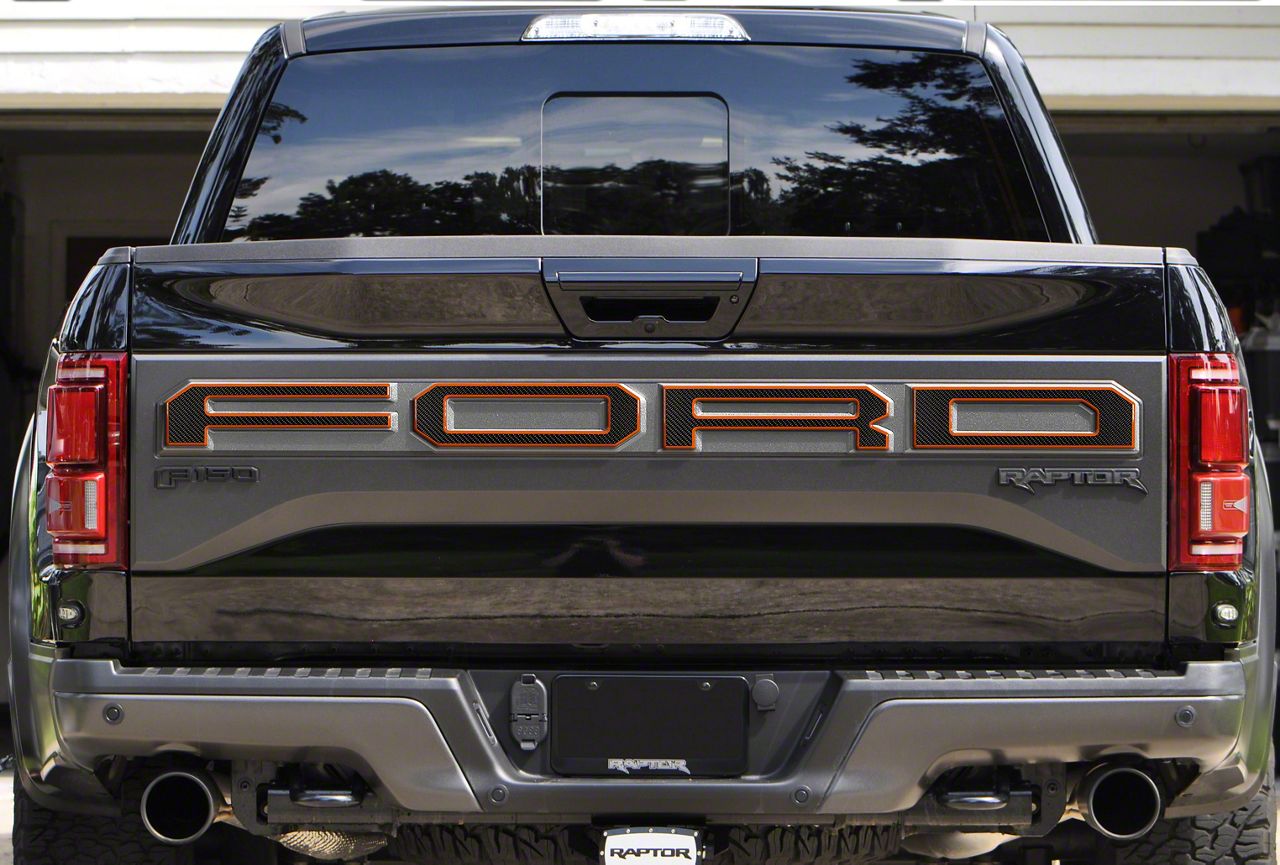 Application. These Tufskinz Tailgate Letter Overlays; Domed Carbon Fiber with Orange Outline fit 2017-2018 F-150 Raptor models with Tailgate Applique.