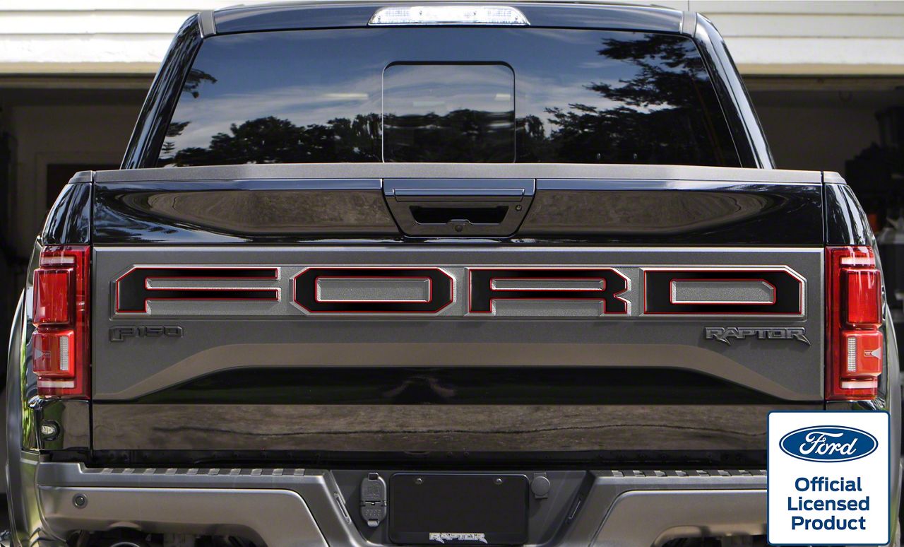 Application. These TufSkinz Matte Black with Red Outline Tailgate Letter Overlays fit all 2017-2018 Ford F-150 Raptor models with Tailgate Appliques