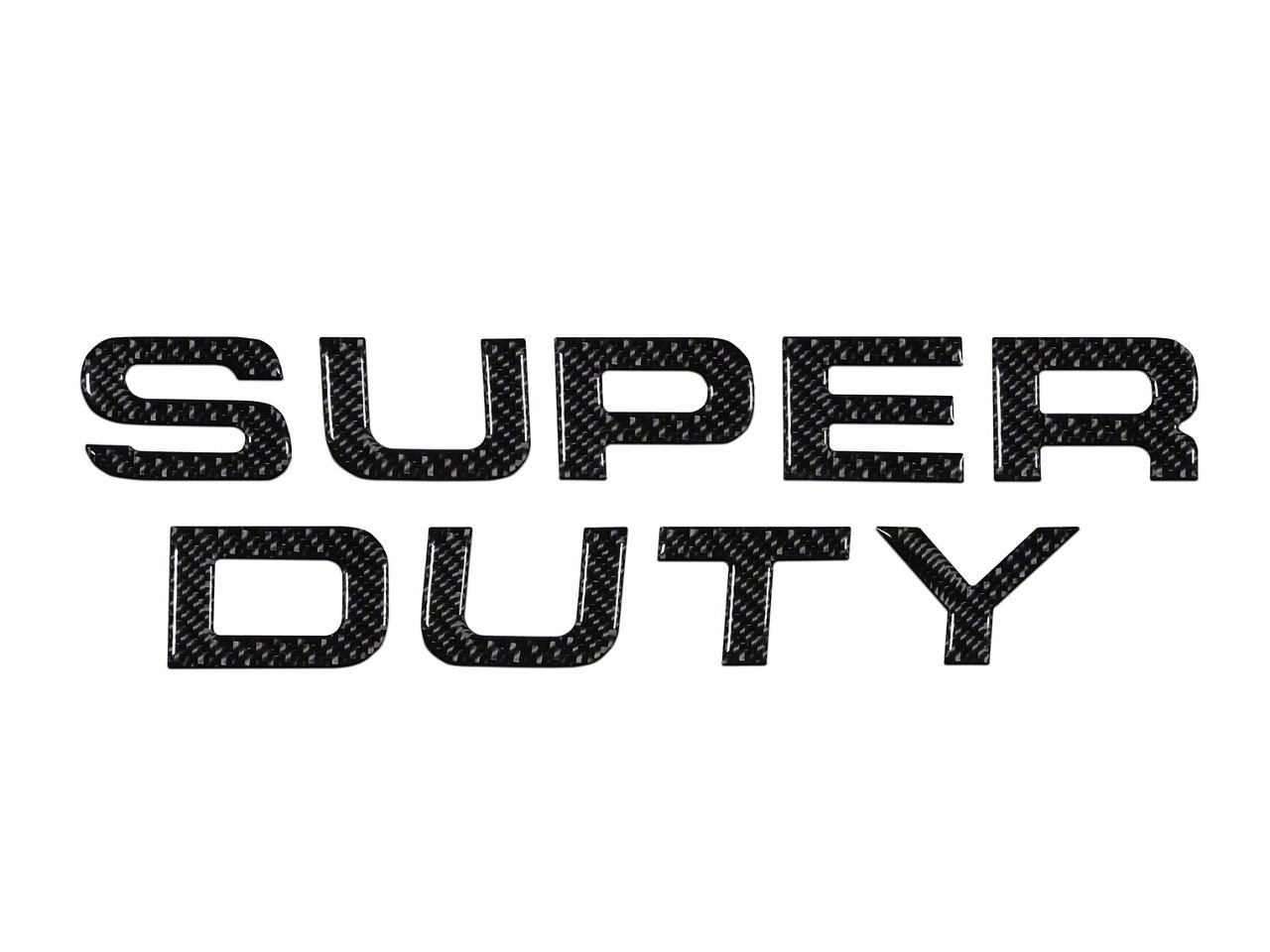 Design. Made in the USA, this 9-piece kit features raised and stylish "Super Duty" letters. Each letter endures a 3-layer process. The first layer creates a high gloss, durable finish. The second layer is a mix of color matches that provides a variety of color options. The third is a 3M auto-grade adhesive. The letters are adorned in a domed carbon fiber theme.