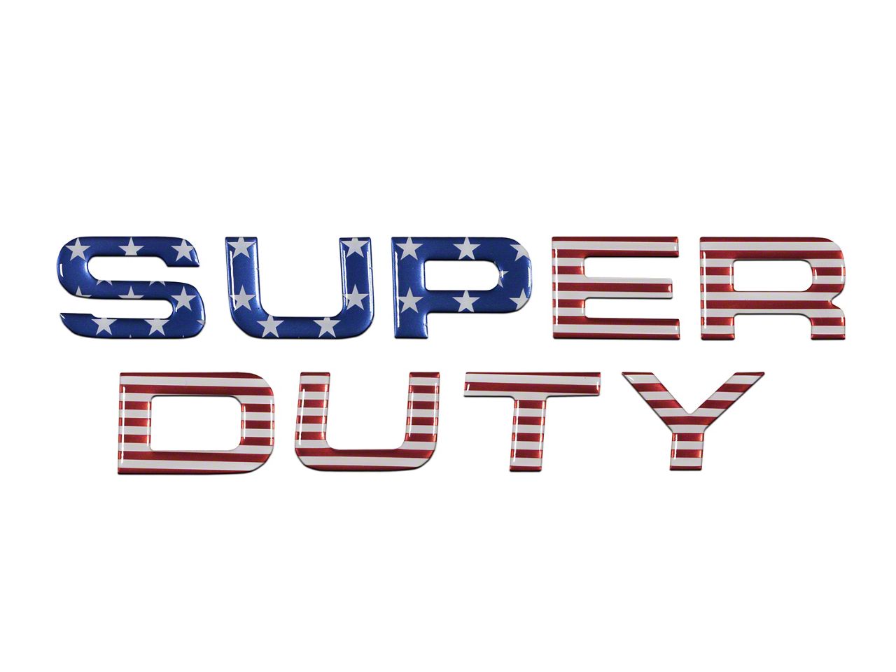Design. Made in the USA, this 9-piece kit features raised and stylish "Super Duty" letters. Each letter endures a 3-layer process. The first layer creates a high gloss, durable finish. The second layer is a mix of color matches that provides a variety of color options. The third is a 3M auto-grade adhesive. The letters are adorned in the American flag.