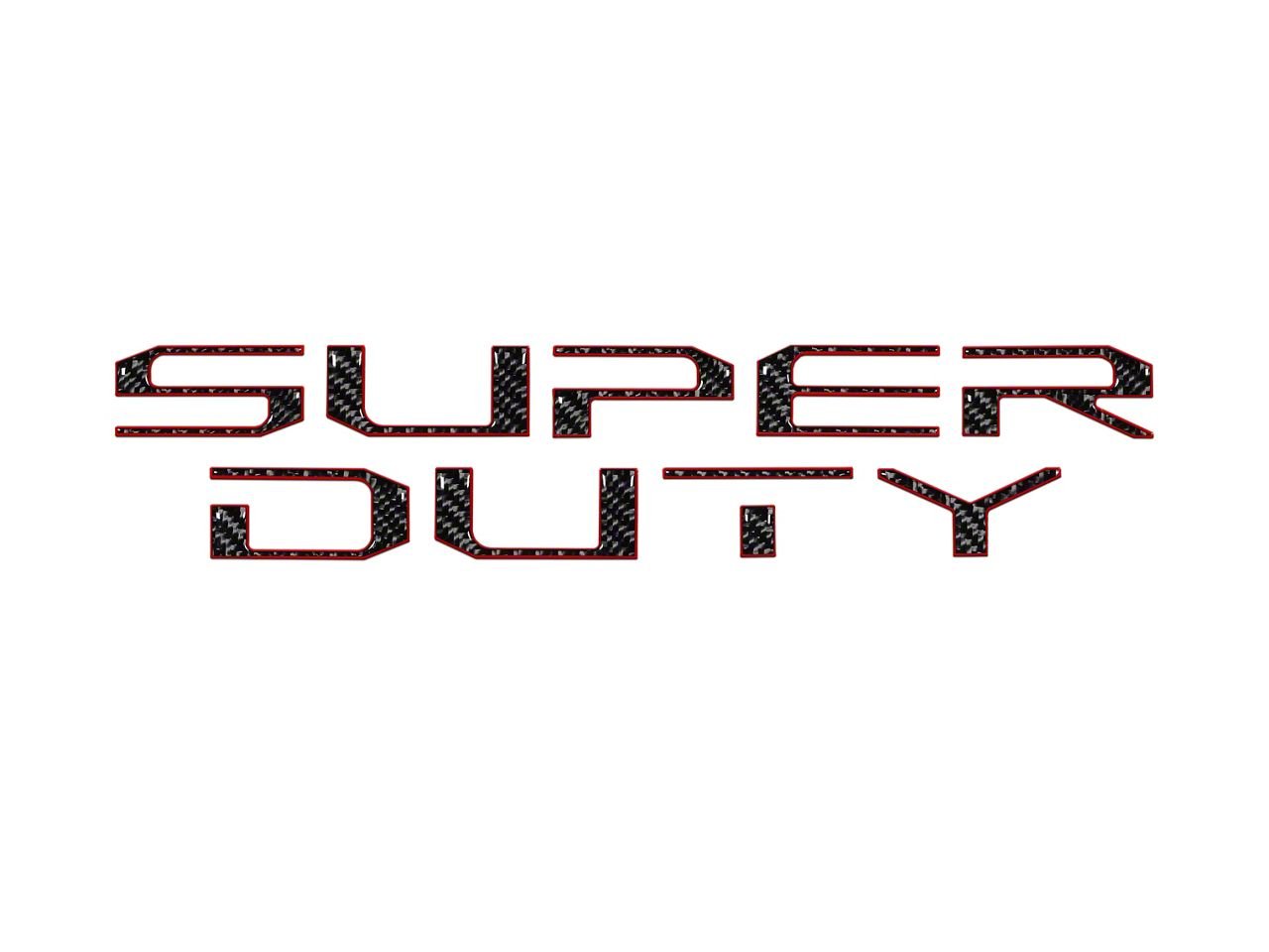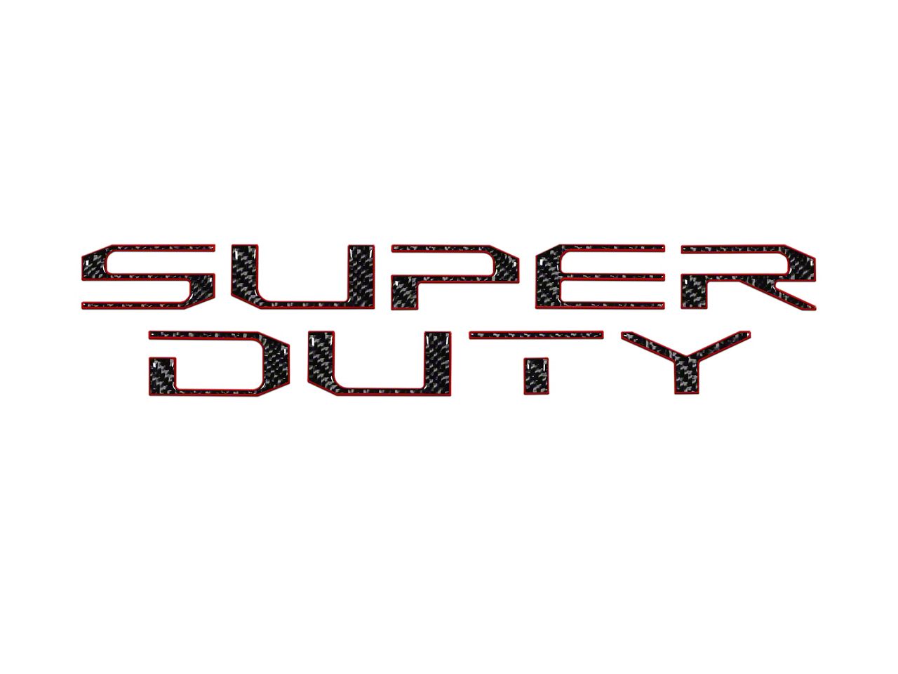 Design. Made in the USA, this 9-piece kit features raised and stylish "Super Duty" letters. Each letter endures a 3-layer process. The first layer creates a high gloss, durable finish. The second layer is a mix of color matches that provides a variety of color options. The third is a 3M auto-grade adhesive. The letters are adorned in domed carbon fiber with a red outline.