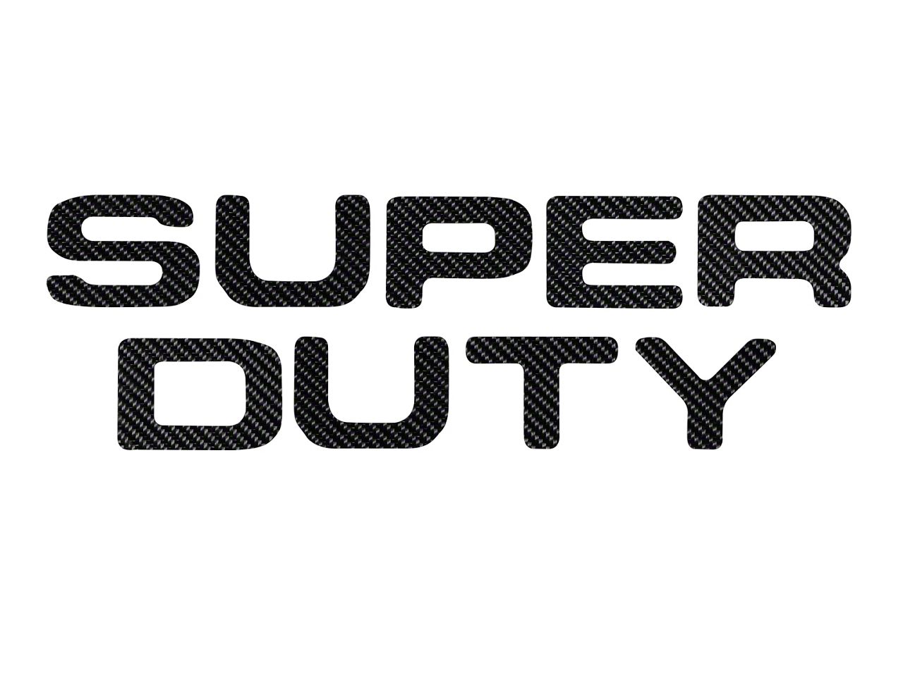 Design. Made in the USA, this 9-piece kit features raised and stylish "Super Duty" letters. Each letter endures a 3-layer process. The first layer creates a high gloss, durable finish. The second layer is a mix of color matches that provides a variety of color options. The third is a 3M auto-grade adhesive. The letters are adorned in raw carbon fiber.