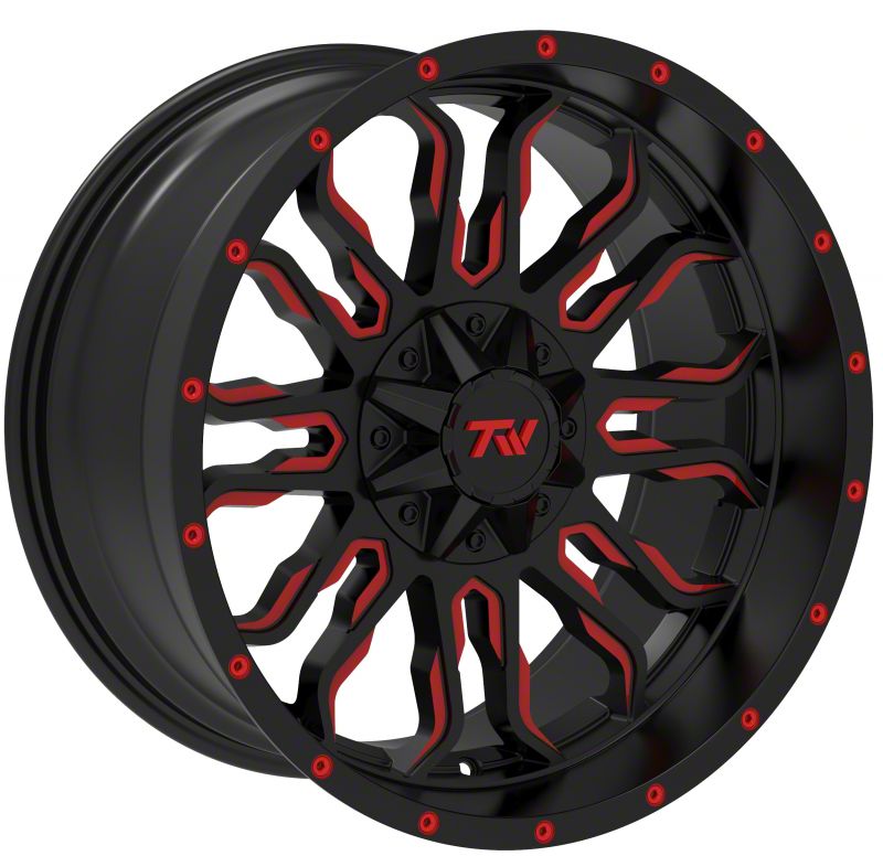 The 20x10 TW Offroad T8 Flame Gloss Black with Red 6-Lug Wheel is completed in a high-quality gloss black finish with red accents. For added protection and good looks, this Wheel features a durable, matte clear coat that is tough enough to stand up against the hazards of everyday driving.