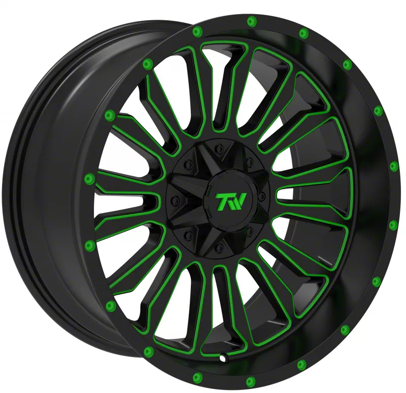 The 20x10 TW Offroad T6 Speed Gloss Black with Green 6-Lug Wheel is completed in a high-quality gloss black finish with green accents. For added protection and good looks, this Wheel features a durable, matte clear coat that is tough enough to stand up against the hazards of everyday driving.