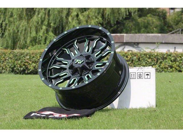 The 20x10 TW Offroad T8 Flame Gloss Black with Green 6-Lug Wheel is completed in a high-quality gloss black finish with green accents. For added protection and good looks, this Wheel features a durable, matte clear coat that is tough enough to stand up against the hazards of everyday driving.