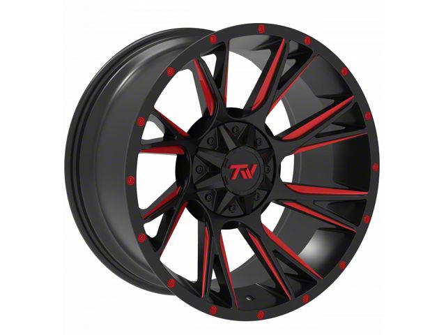 The 20x10 TW Offroad T12 Blade Gloss Black with Red 6-Lug Wheel is completed in a high-quality gloss black finish with red accents. For added protection and good looks, this Wheel features a durable, matte clear coat that is tough enough to stand up against the hazards of everyday driving.
