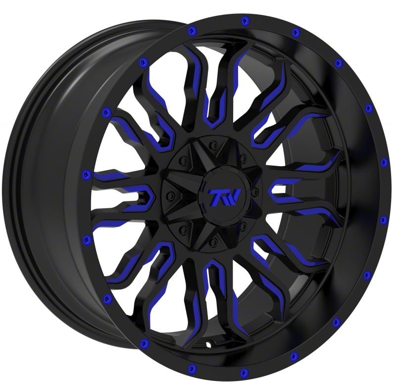 The 20x10 TW Offroad T8 Flame Gloss Black with Blue 6-Lug Wheel is completed in a high-quality gloss black finish with blue accents. For added protection and good looks, this Wheel features a durable, matte clear coat that is tough enough to stand up against the hazards of everyday driving.