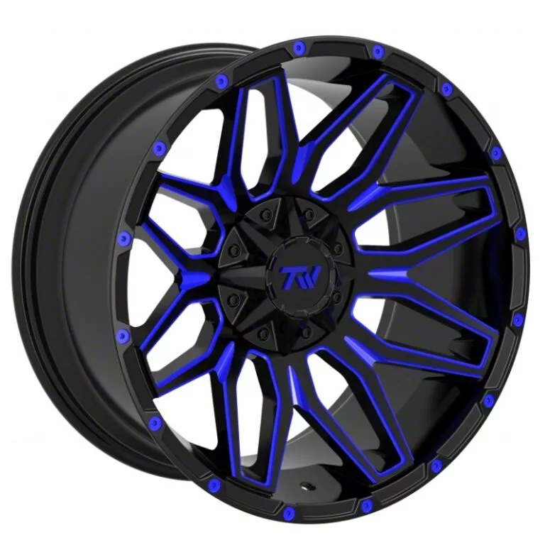 TW Offroad T3 Lotus Gloss Black with Blue 6-Lug Wheel; 20x9; 0mm Offset This wheel offers a sleek and modern design that enhances the visual appeal of your vehicle. Its metallic gunmetal finish adds a touch of elegance and sophistication, making it a perfect fit for those who want to make a bold statement on the road.