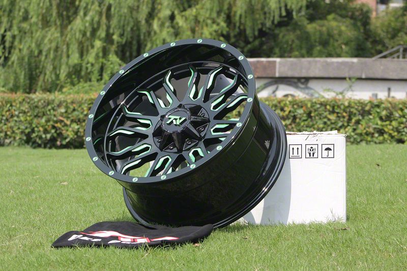 The 20x10 TW Offroad T8 Flame Gloss Black with Green 6-Lug Wheel is completed in a high-quality gloss black finish with green accents. For added protection and good looks, this Wheel features a durable, matte clear coat that is tough enough to stand up against the hazards of everyday driving.