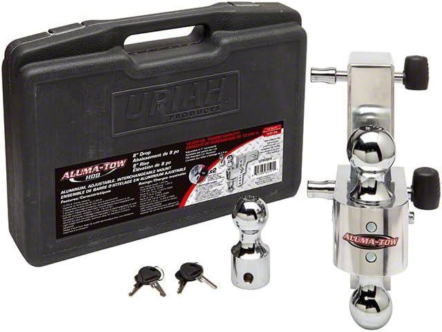 The Uriah Products Aluma-Tow Adjustable Aluminum Ball Mount, complete with a case, is your ideal towing companion. Boasting a robust 12,000 lbs. gross trailer weight capacity, it handles heavier loads with ease. Designed to fit standard 2-1/2 inch square receivers, this adjustable mount offers a maximum drop and rise of 8 inches each. It includes three interchangeable, chrome-plated steel hitch balls to accommodate different vehicle sizes. Additionally, it comes with a heavy-duty carrying case for convenient transport and storage of the hitch mount, tools, and extra hitch balls.