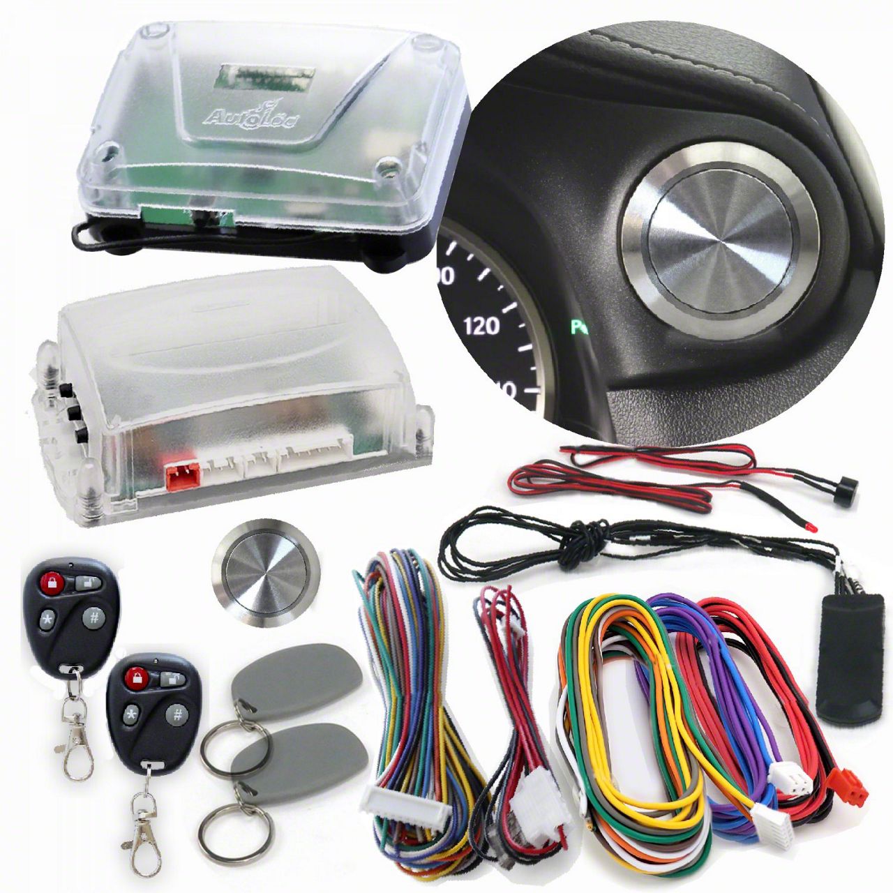 Kit includes: 12V non-illuminated billet aluminum push button switch, start/stop remote start control module, and keyless entry system with 2 remote key fobs and Bluetooth smartphone app.