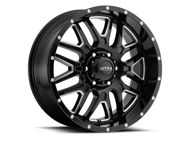 This 20x10 Ultra Wheels Hunter Gloss Black Milled 6-Lug Wheel is completed in a high-quality gloss black finish with steel milled accents that will be the envy of everyone. There's a durable clear coat that protects against driving hazards.