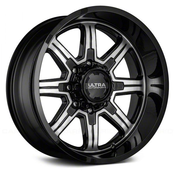 This 17x9 Ultra Wheels Menace Gloss Black with Diamond Cut Accents 8-Lug Wheel is completed in a high-quality gloss black finish with diamond-cut accents for a striking appearance that will be the envy of everyone. There's a durable clear coat that helps protect against driving hazards.