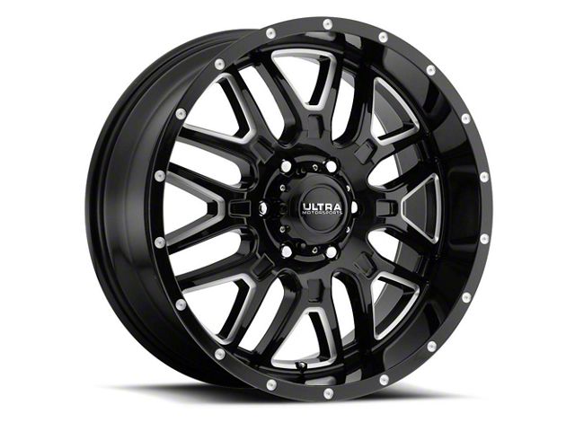 Ultra Wheels Hunter Gloss Black Milled 8-Lug Wheel; 18x9; 12mm Offset offers a striking balance between style and durability. The design speaks to the brand's commitment to quality, enhancing the vehicle's appearance with its distinct look. This wheel, with its unique aesthetics, is ideal for drivers who appreciate a blend of modern design and robust functionality.