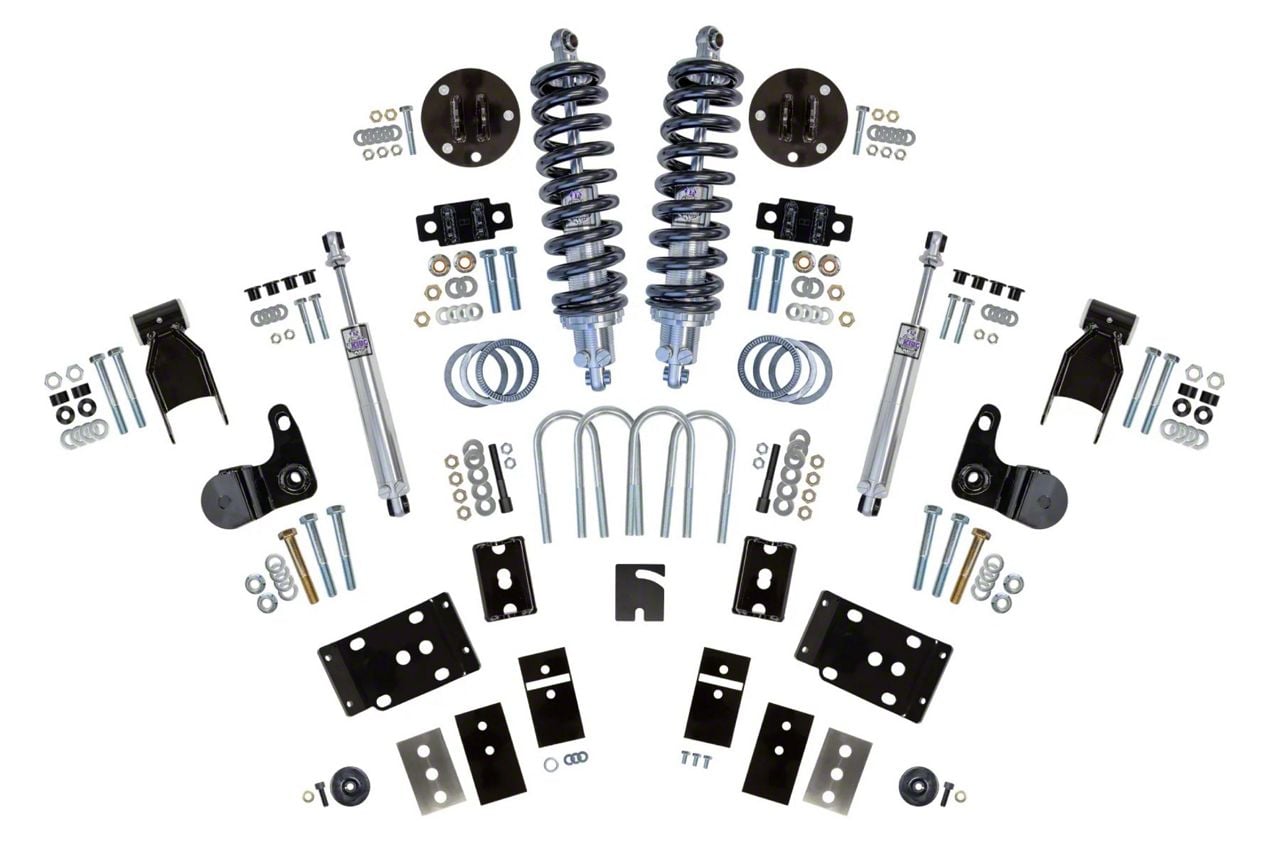 Construction and Appearance. Constructed in the USA using robust components such as double shear front mounts and precision-machined Delrin bushings, the UMI lowering kit ensures long-term durability and noise-free performance. The Viking coilovers and rear dampers provide extensive tuning capability with 19 levels of compression and rebound adjustment. Shock relocation-compatible U-bolt plates and adjustable pinion angle hardware further enhance the kit's adaptability to different driving conditions.