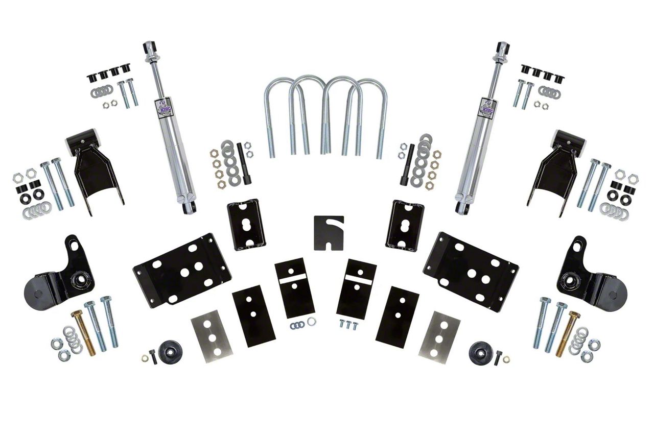 Construction and Appearance. Proudly made in the USA, the kit features precision-built components including U-bolt plates with shock relocation compatibility, 2.5° pinion shims, and a transmission spacer to maintain proper driveline angles. Designed to work with both steel and composite leaf springs, ride height can be adjusted in 0.5-inch increments to suit various truck weights and configurations.