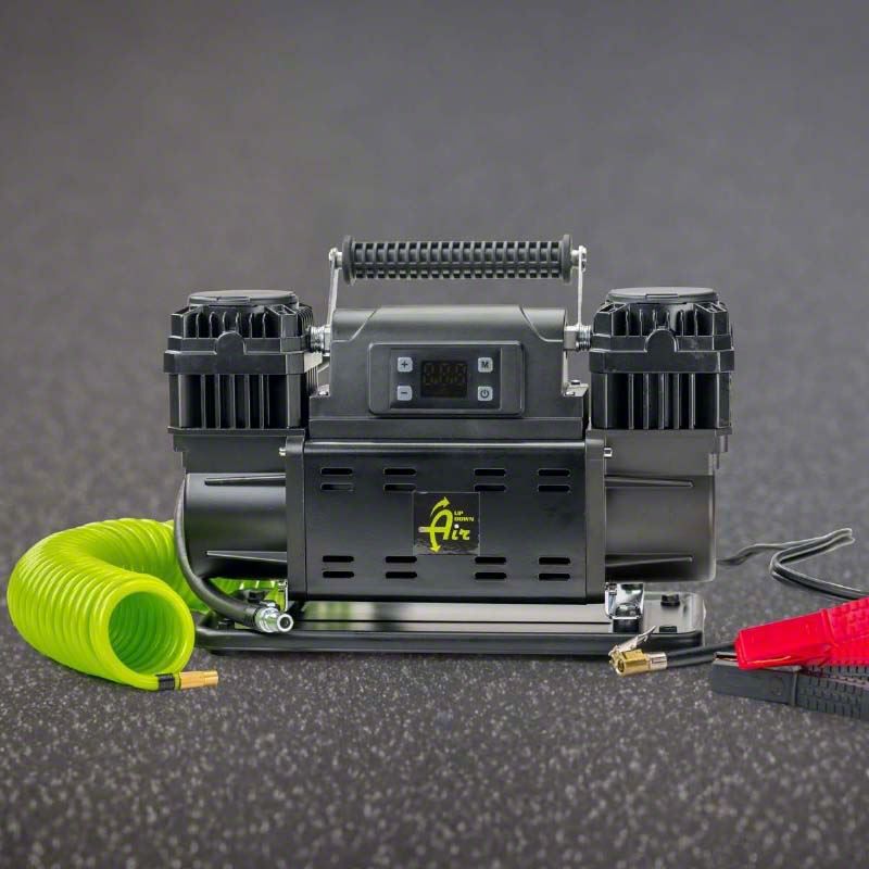 High-Performance Air Compressor. The Up Down Air EGOI Portable Air Compressor System delivers powerful performance with its dual motor composition, providing an efficient and reliable air supply for various applications. This portable compressor is essential for on-the-go air needs, ensuring you are never left stranded.
