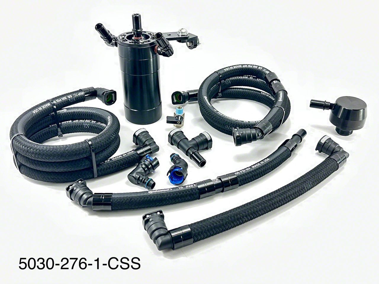 Installation. Designed for easy installation, this catch can includes plug-n-play fittings at both the can and separator connections. It also comes with a 5/8-inch oil-resistant Continental braided hose, ensuring a secure and hassle-free setup without the need for extensive modifications.