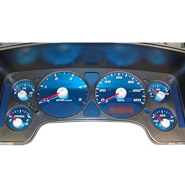 Stainless Steel Gauge Face. The face is die-cut to fit seamlessly into your instrument panel and features a durable stainless steel overlay and non-fading anodized blue gauge face color. Silkscreened lettering ensures clear and easy-to-read markings. Installation is effortless and requires no modifications.